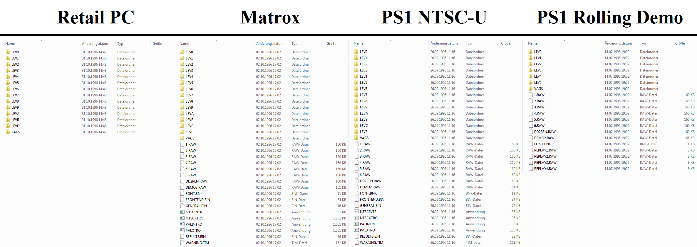 The "LEV*" folders are Level files and i think the "VAGS" folder including the soundfiles. I think, that the "LEV0" folder is the menu. On the Retail PC version is the "LEVC" folder missing. When we don't count the "LEV0" and the "VAGS" folder on Matrox or PS1 version, then we have 13 folders. But the game only has 11 levels (7 Racetracks and 4 Derby bowls), so this could be hidden tracks or parts from the menu. It also looks like that the PS1 Rolling Demo has more tracks, than the Pine Hills Raceway. I hope someone make them accessible. Update: Done by "MMRivit"*