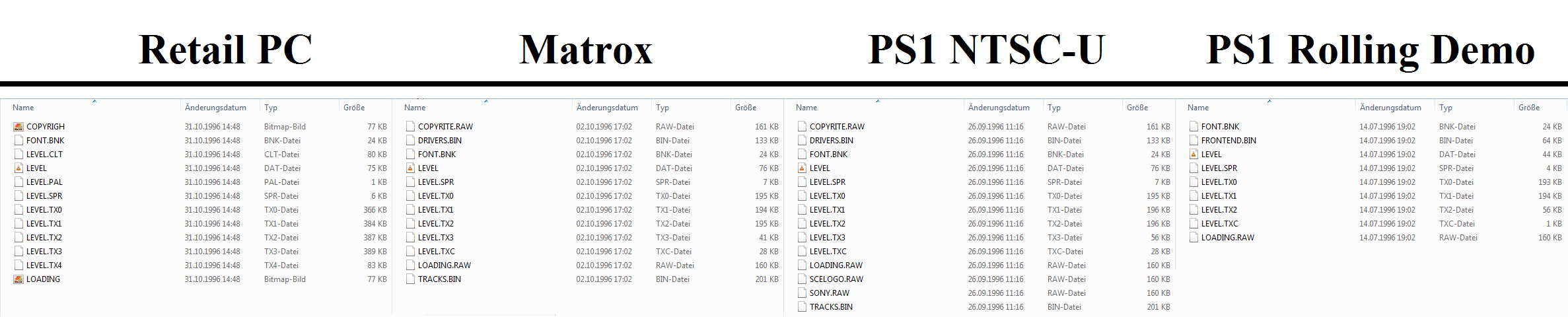 Now i open the "LEV0" folder and we can see, that the Retail PC version is not using the "*.RAW" format for pictures, it using bitmap files (*.BMP). Instead of using the "*.TXC" format it using "*.TX4". It also missing the "DRIVERS.BIN" and "TRACKS.BIN" file. But it has a LEVEL.PAL file. I hope someone can explain me these files. Again, we see that the Matrox version is surely a PS1 Port.