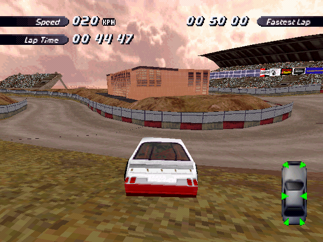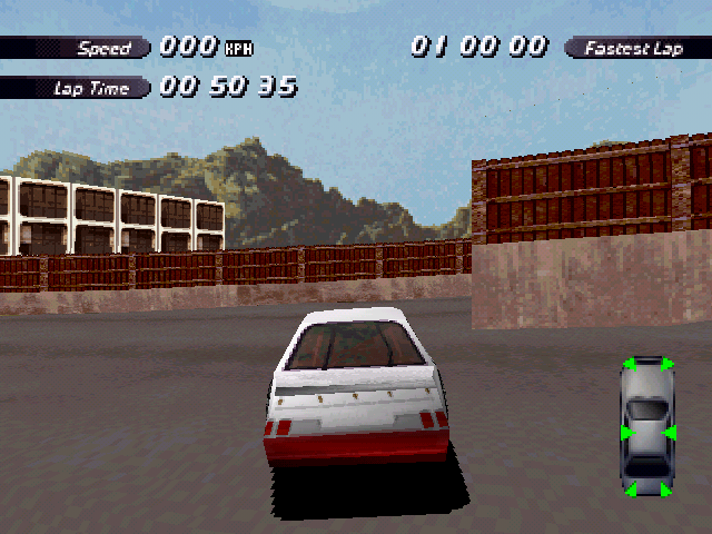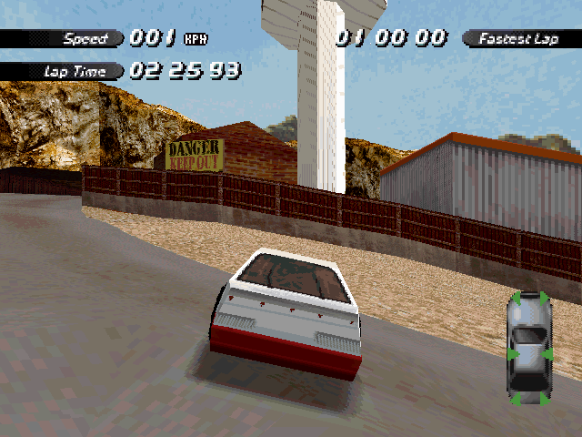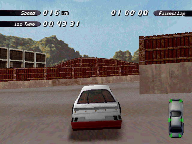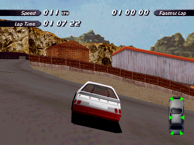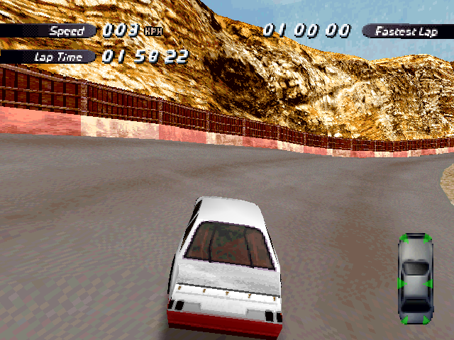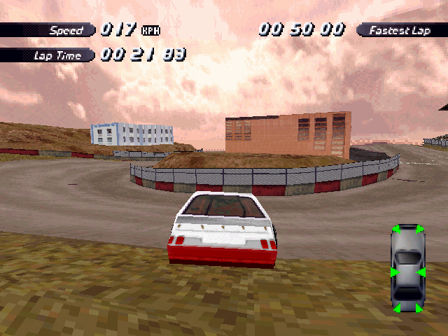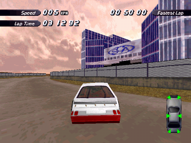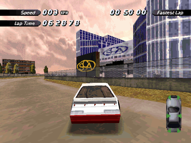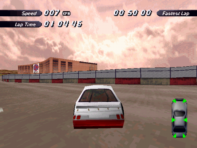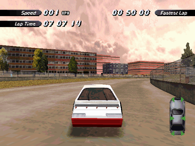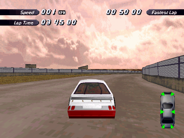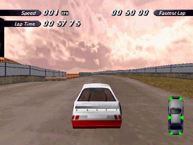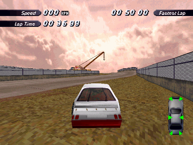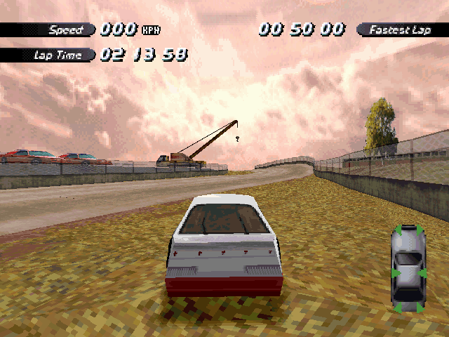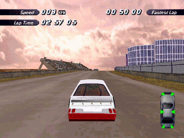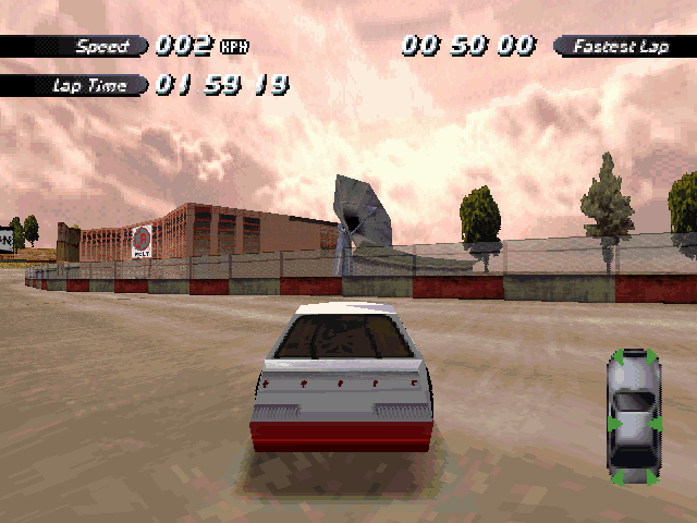 | On the Retail PC version looking the cars a bit Orange through the fence, but they're Red like in the PS1 version. |
