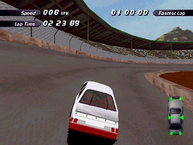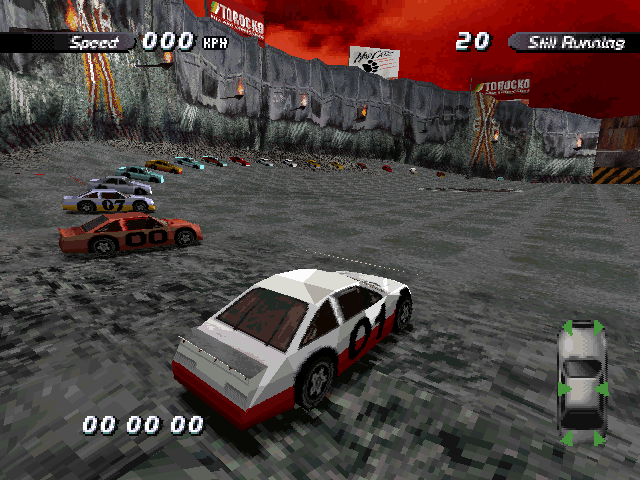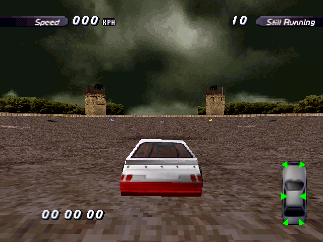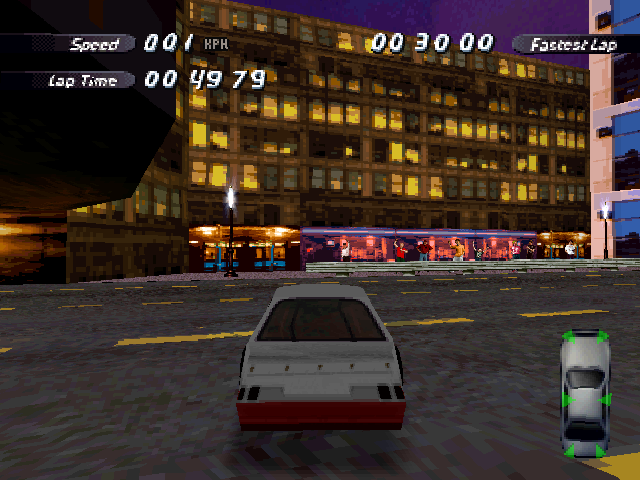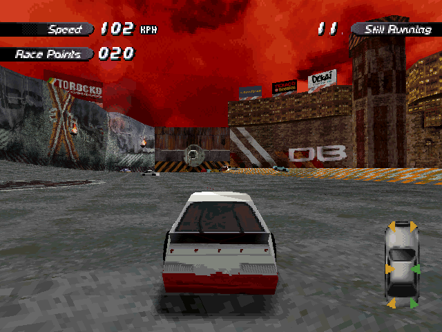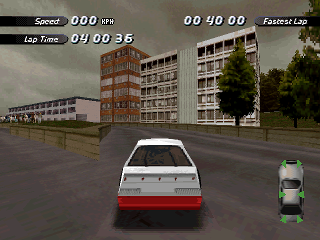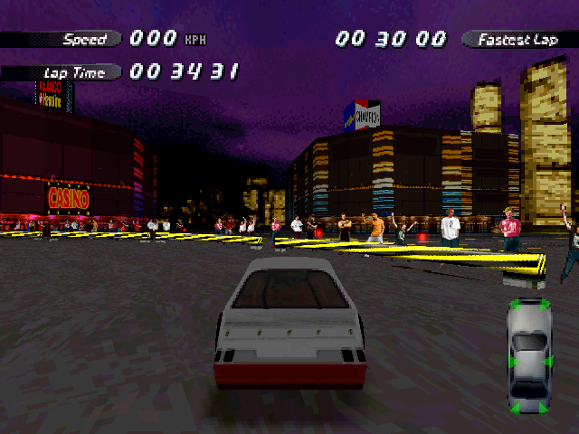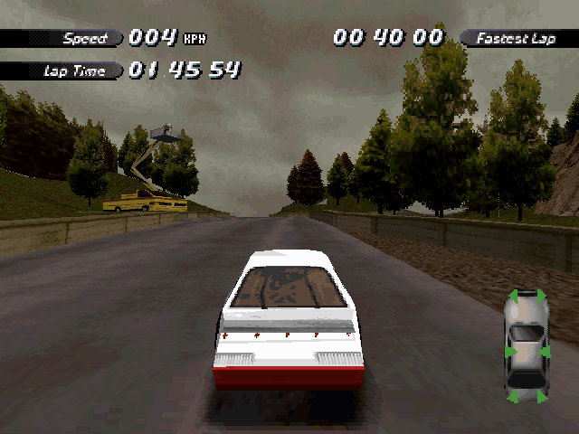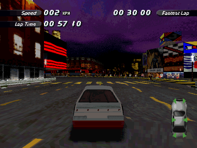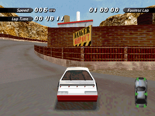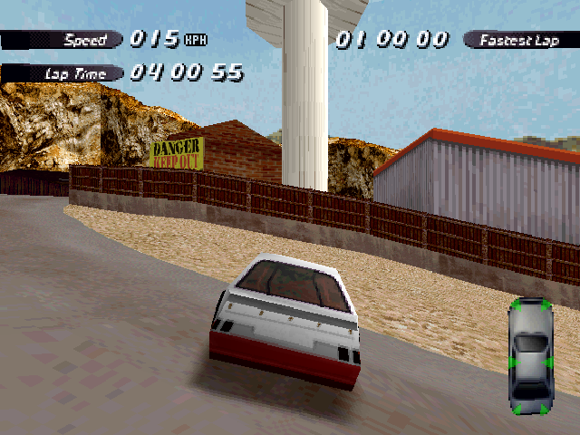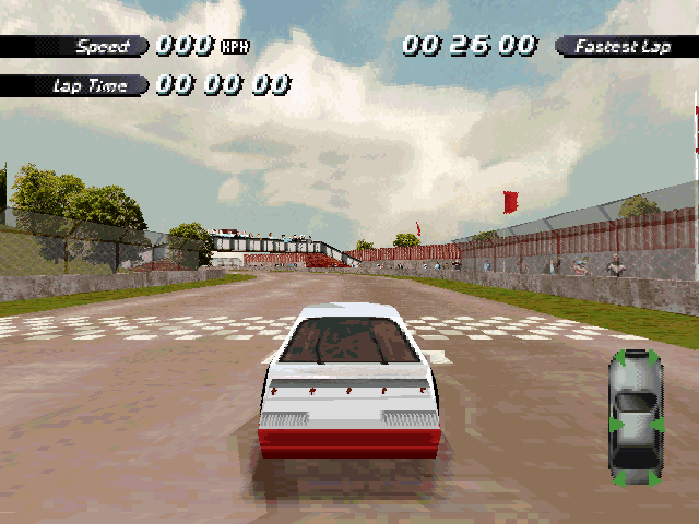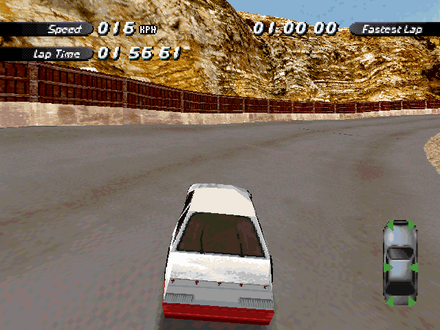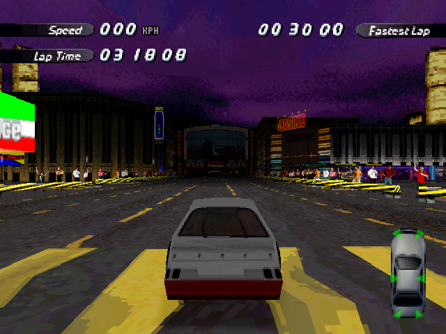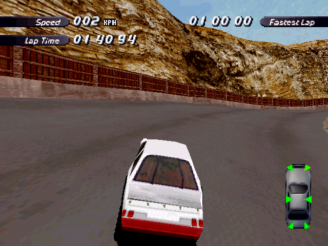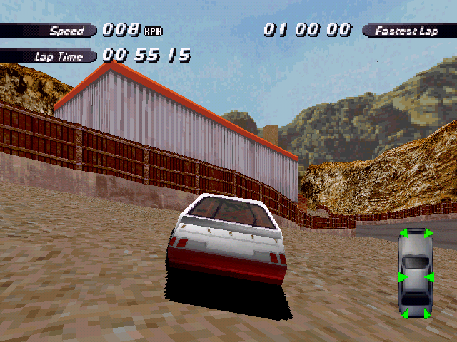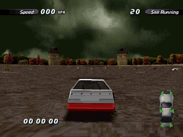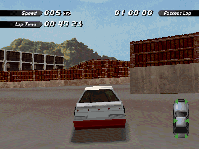 | On the Retail PC version looking the cars a bit Orange through the fence, but they're Red like in the PS1 version. |