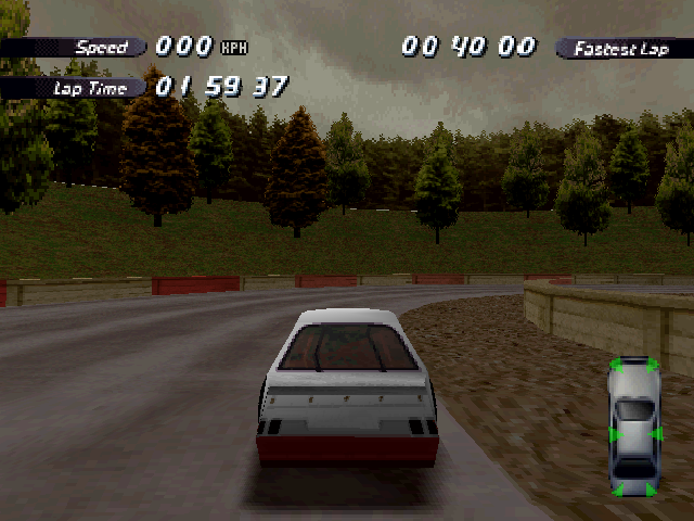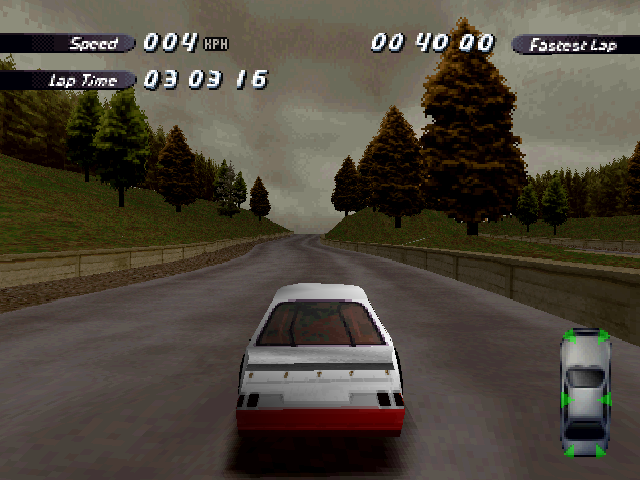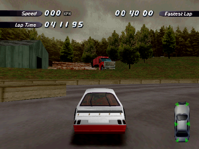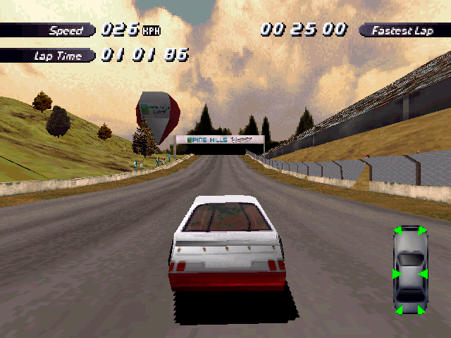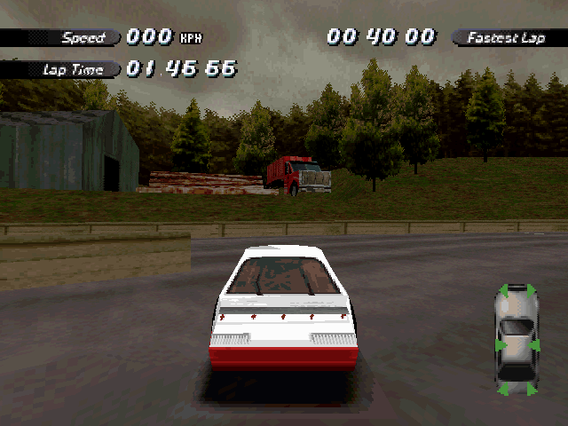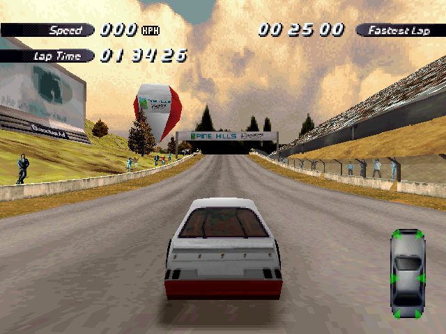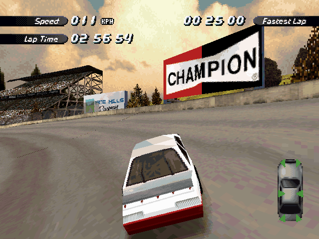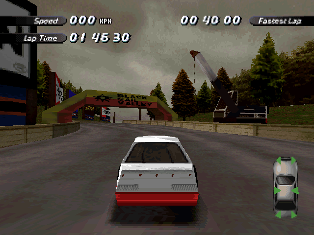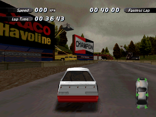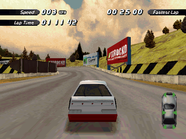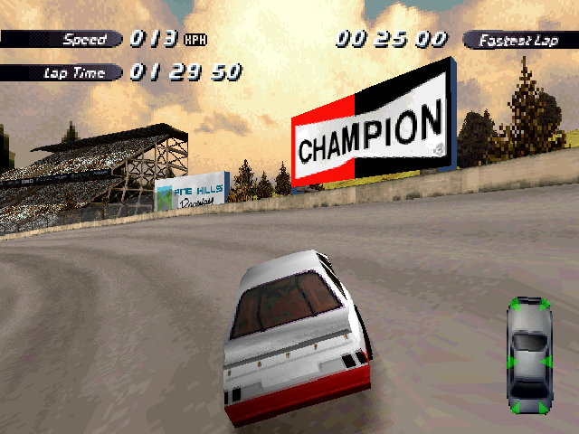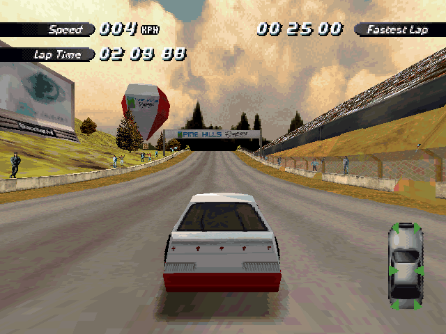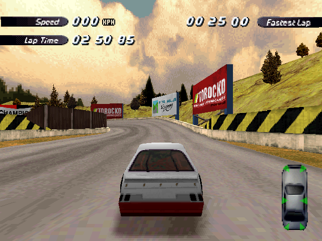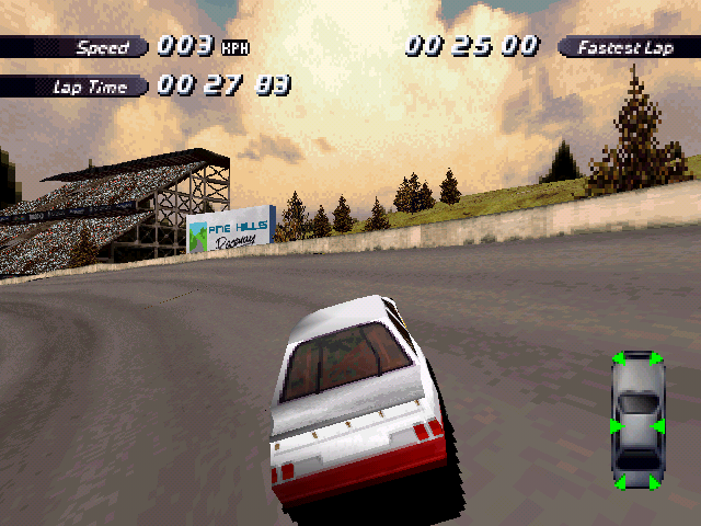 Now i will compare which details, are missing in the racing tracks from the Matrox version. The tracks from PS1 and PC version have the same details. In my opinion they removed a few things, to try to improve the performance of the Matrox version. Same here, Left is Retail PC, middle is Matrox, and on the right side is PS1. On the Pine Hills Raceway is the fourth picture the PS1 Rolling Demo. I will enumerate the differences at most places in the tracks, so don't be surprised if the descriptions are repeated.