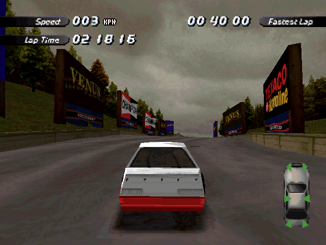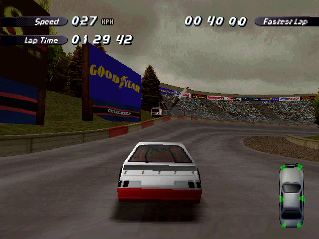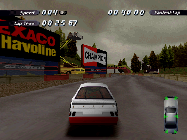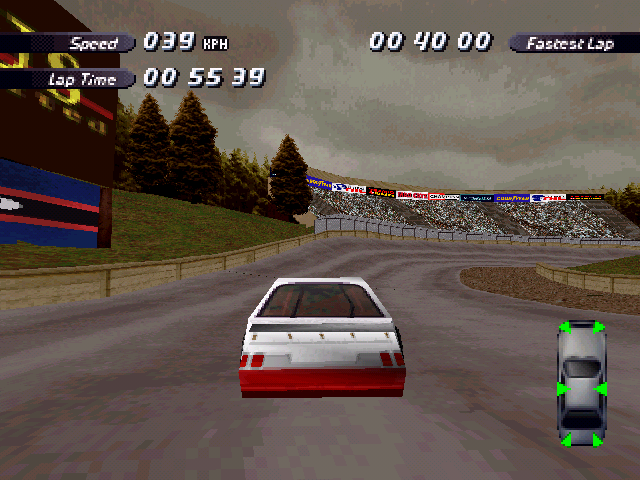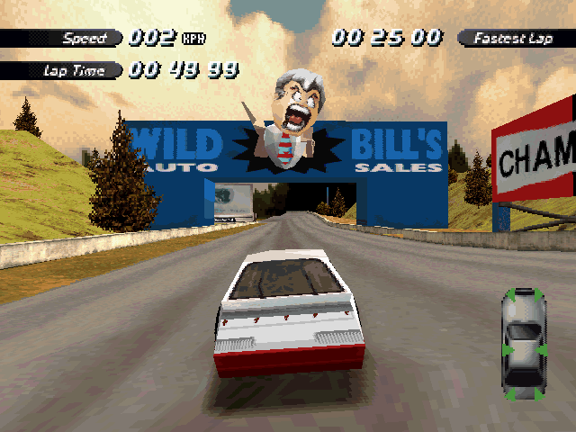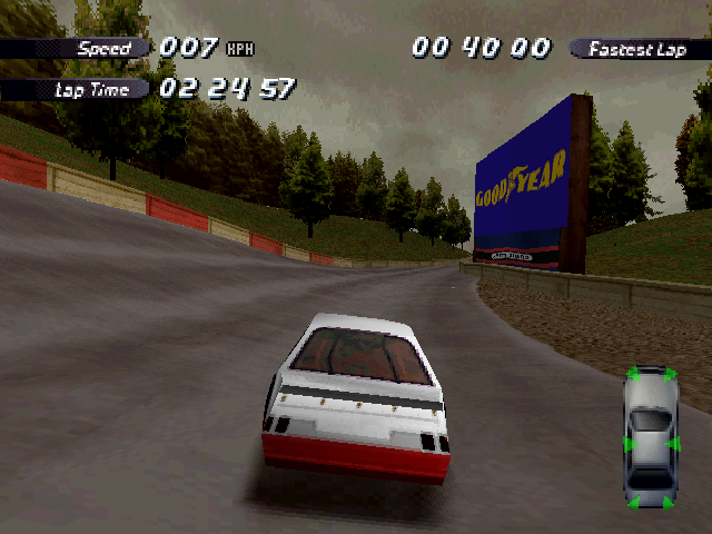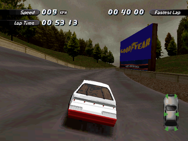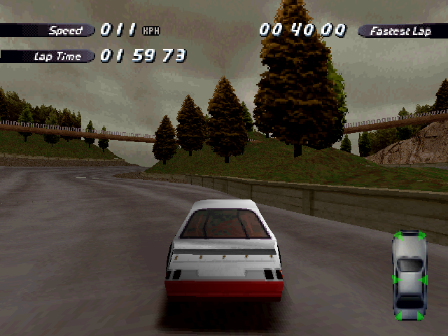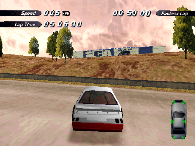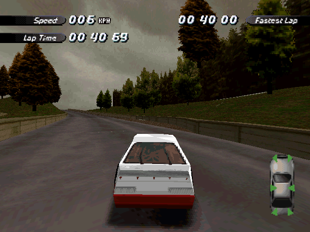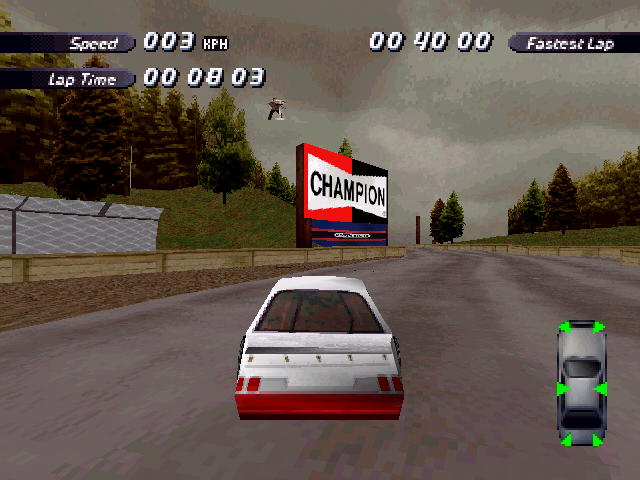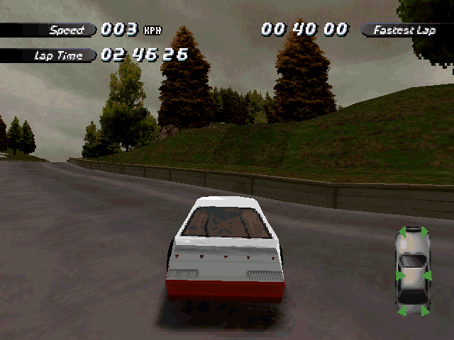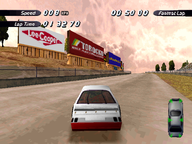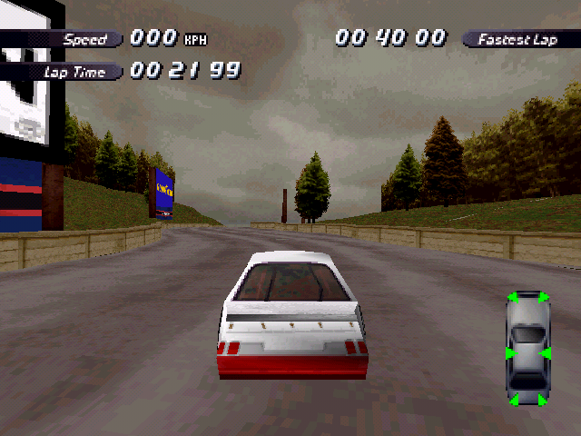 Now i will compare which details, are missing in the racing tracks from the Matrox version. The tracks from PS1 and PC version have the same details. In my opinion they removed a few things, to try to improve the performance of the Matrox version. Same here, Left is Retail PC, middle is Matrox, and on the right side is PS1. On the Pine Hills Raceway is the fourth picture the PS1 Rolling Demo. I will enumerate the differences at most places in the tracks, so don't be surprised if the descriptions are repeated.